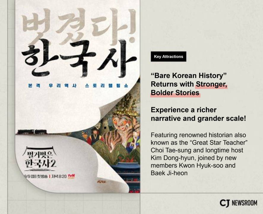 Also returning for a second season is Korea’s signature history entertainment program, “Bare Korean History,” which premiered on September 9. The new season promises an even richer narrative and grander scale, taking viewers through the defining moments and colorful figures that shaped Korea’s five-thousand-year history.